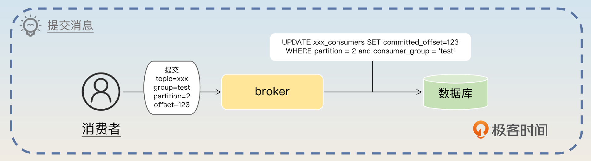 为了存储每一个消费者消费的偏移量,我需要一张新的表。比如说在 create_order 这个例子里面,有一张表叫做 create_order_consumers。这张表有三个关键列:消费者组名字、分区和偏移量。而每次消费者提交消息,对于 borker 来说就是更新这张表的偏移量。
