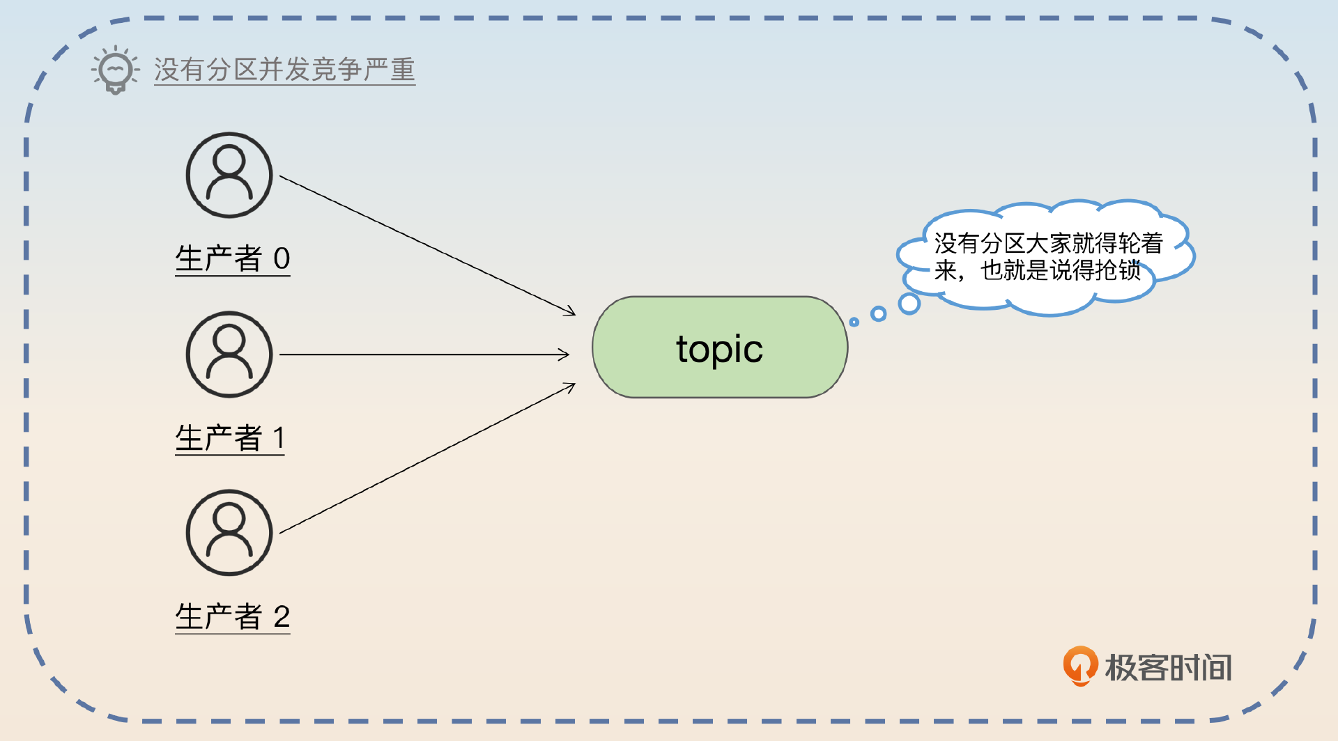 topic 是必不可少,因为它代表的是不同的业务。然后面临的选择就是要不要在 topic 内部进一步划分分区。假如说不划分分区的话,有一个很大的缺点,就是并发竞争,比如说所有的生产者都要竞争同一把锁才能写入到 topic,消费者要读取数据也必须竞争同一把锁才能读取数据,这样性能很差。所以 topic 内部肯定要进一步细分,因此需要引入分区的设计。