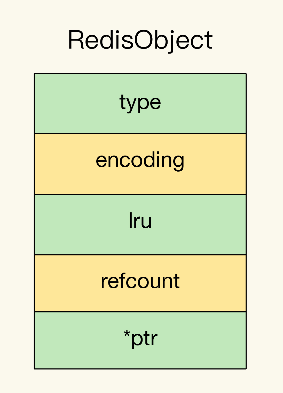 RedisObject的内部组成包括了type、encoding、lru和refcount 4个元数据,以及1个*ptr指针。