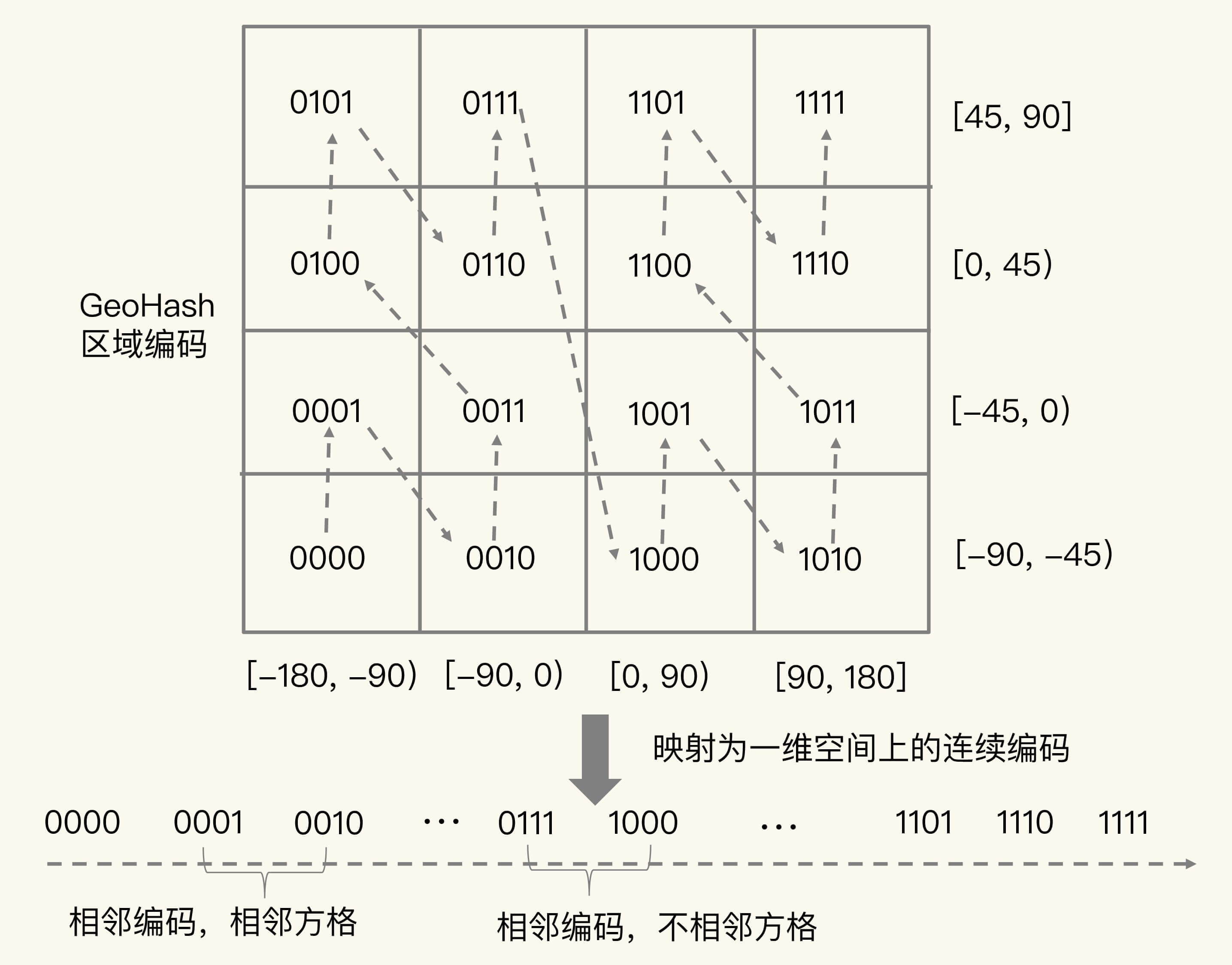 这4个分区对应了4个方格,每个方格覆盖了一定范围内的经纬度值,分区越多,每个方格能覆盖到的地理空间就越小,也就越精准。我们把所有方格的编码值映射到一维空间时,相邻方格的GeoHash编码值基本也是接近的,如下图所示: