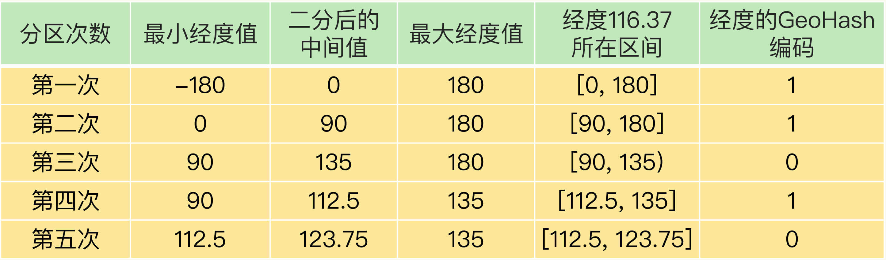 按照这种方法,做完5次分区后,我们把经度值116.37定位在[112.5, 123.75]这个区间,并且得到了经度值的5位编码值,即11010。这个编码过程如下表所示: