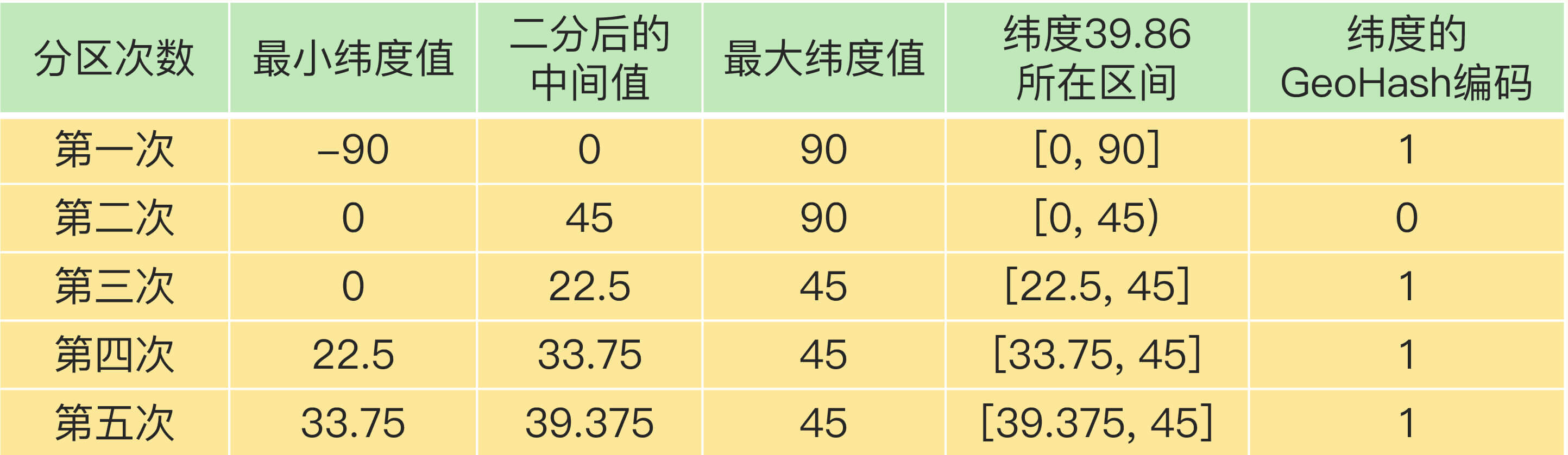 对纬度的编码方式,和对经度的一样,只是纬度的范围是[-90,90],下面这张表显示了对纬度值39.86的编码过程。
