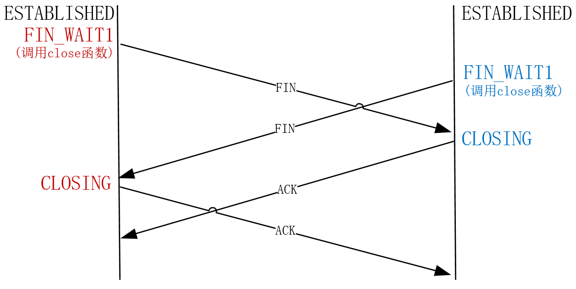 接下来,双方在等待ACK报文的过程中,都等来了FIN报文。这是一种新情况,所以连接会进入一种叫做CLOSING的新状态,它替代了FIN_WAIT2状态。此时,内核回复ACK确认对方发送通道的关闭,仅己方的FIN报文对应的ACK还没有收到。所以,CLOSING状态与LAST_ACK状态下的连接很相似,它会在适时重发FIN报文的情况下最终关闭。