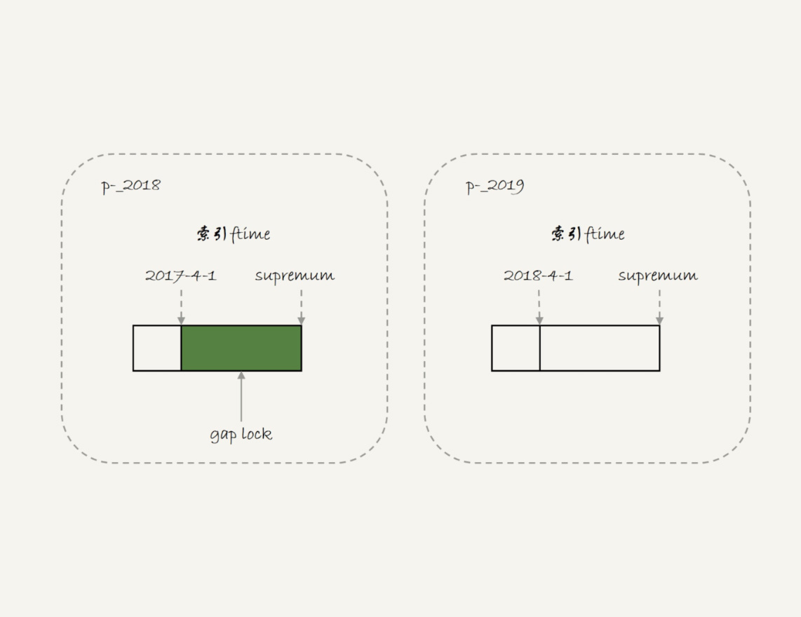 但是,从上面的实验效果可以看出,session B的第一个insert语句是可以执行成功的。这是因为,对于引擎来说,p_2018和p_2019是两个不同的表,也就是说2017-4-1的下一个记录并不是2018-4-1,而是p_2018分区的supremum。所以T1时刻,在表t的ftime索引上,间隙和加锁的状态其实是图4这样的: