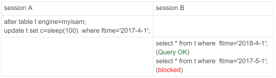 这正是因为MyISAM的表锁是在引擎层实现的,session A加的表锁,其实是锁在分区p_2018上。因此,只会堵住在这个分区上执行的查询,落到其他分区的查询是不受影响的。