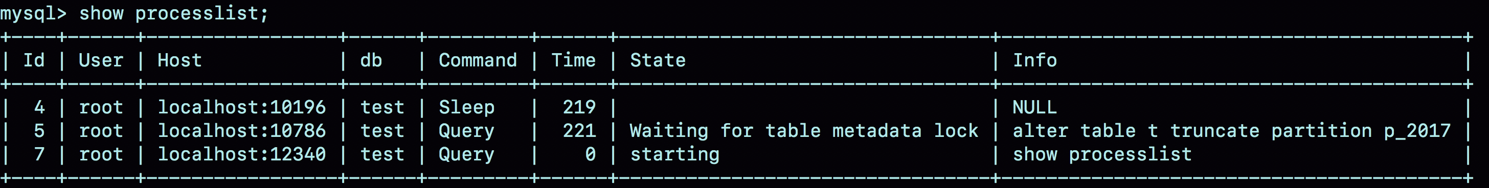 可以看到,虽然session B只需要操作p_2017这个分区,但是由于session A持有整个表t的MDL锁,就导致了session B的alter语句被堵住。