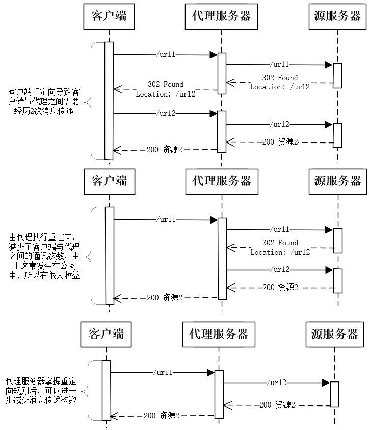 可见,重定向增加了请求的数量。尤其客户端在公网中时,由于公网速度慢、成本高、路径长、不稳定,而且为了信息安全性还要用TLS协议加密,这些都降低了网络性能。从上面的REST架构图可以看到,HTTP请求会经过多个代理服务器,如果将重定向工作交由代理服务器完成,就能减少网络消耗,如下图所示: