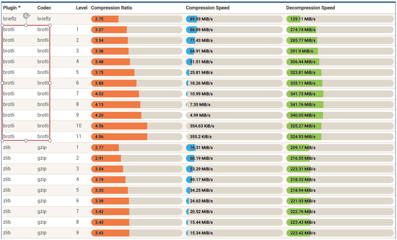 虽然目前gzip使用最为广泛,但它的压缩效率以及执行速度其实都很一般,Google于2015年推出的Brotli 算法在这两方面表现都更优秀(也就是上文中的br),其对比数据如下: