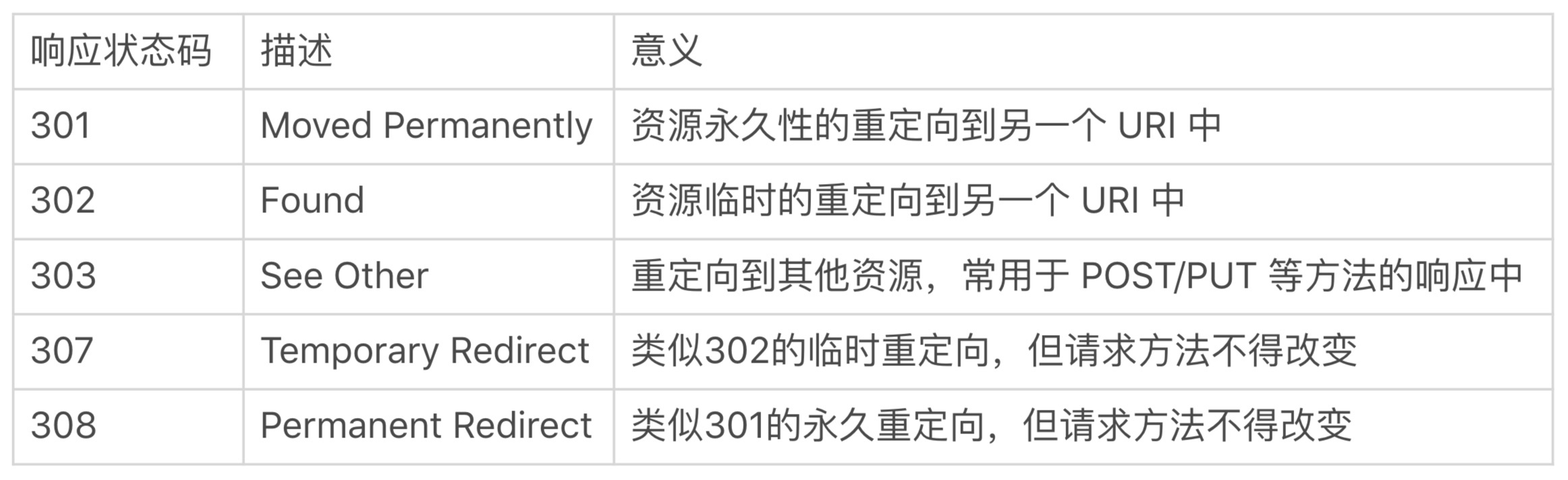 更进一步,客户端还可以缓存重定向响应。RFC规范定义了5个重定向响应码(如下表所示),其中客户端接收到301和308后都可以将重定向响应缓存至本地,之后客户端会自动用url2替代url1访问网络资源。