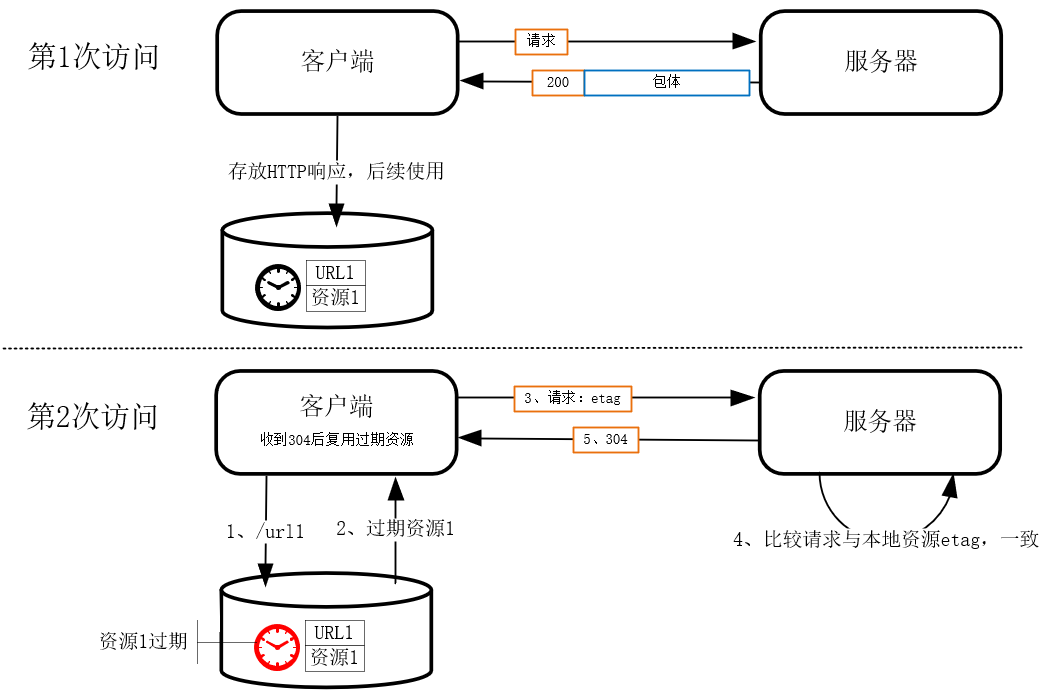 当然,过期的缓存也仍然可以提升性能,如下图所示,当客户端发现缓存过期后,会取出缓存的摘要(摘要是从第1次请求的响应中拿到的),把它放在请求的Etag头部中再发给服务器。而服务器获取到请求后,会将本地资源的摘要与请求中的Etag相比较,如果不同,那么缓存没有价值,重新发送最新资源即可;如果摘要与Etag相同,那么仅返回不含有包体的304 Not Modified响应,告知客户端缓存仍然有效即可,这就省去传递可能高达千百兆的文件资源。