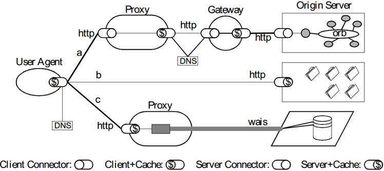 浏览器上的缓存只能为一个用户使用,故称为私有缓存。代理服务器上的缓存可以被许多用户使用,所以称为共享缓存。可见,共享缓存带来的性能收益被庞大的客户端群体放大了。你可以看到在下面的REST架构图中,表示缓存的$符号(缓存的英文名称是cache,由于它的发音与cash很像,所以许多英文文档中用美元符号来表示缓存)既存在于User Agent浏览器中,也存在于Proxy正向代理服务器和Gateway反向代理上。