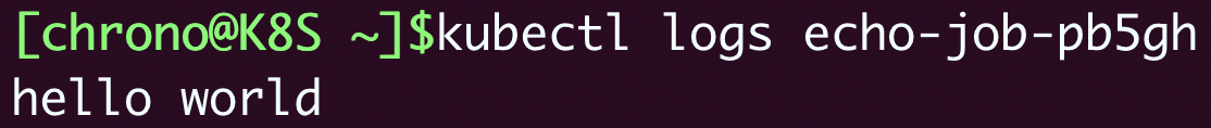你还可以看到,Pod被自动关联了一个名字,用的是Job的名字(echo-job)再加上一个随机字符串(pb5gh),这当然也是Job管理的“功劳”,免去了我们手工定义的麻烦,这样我们就可以使用命令 kubectl logs 来获取Pod的运行结果: