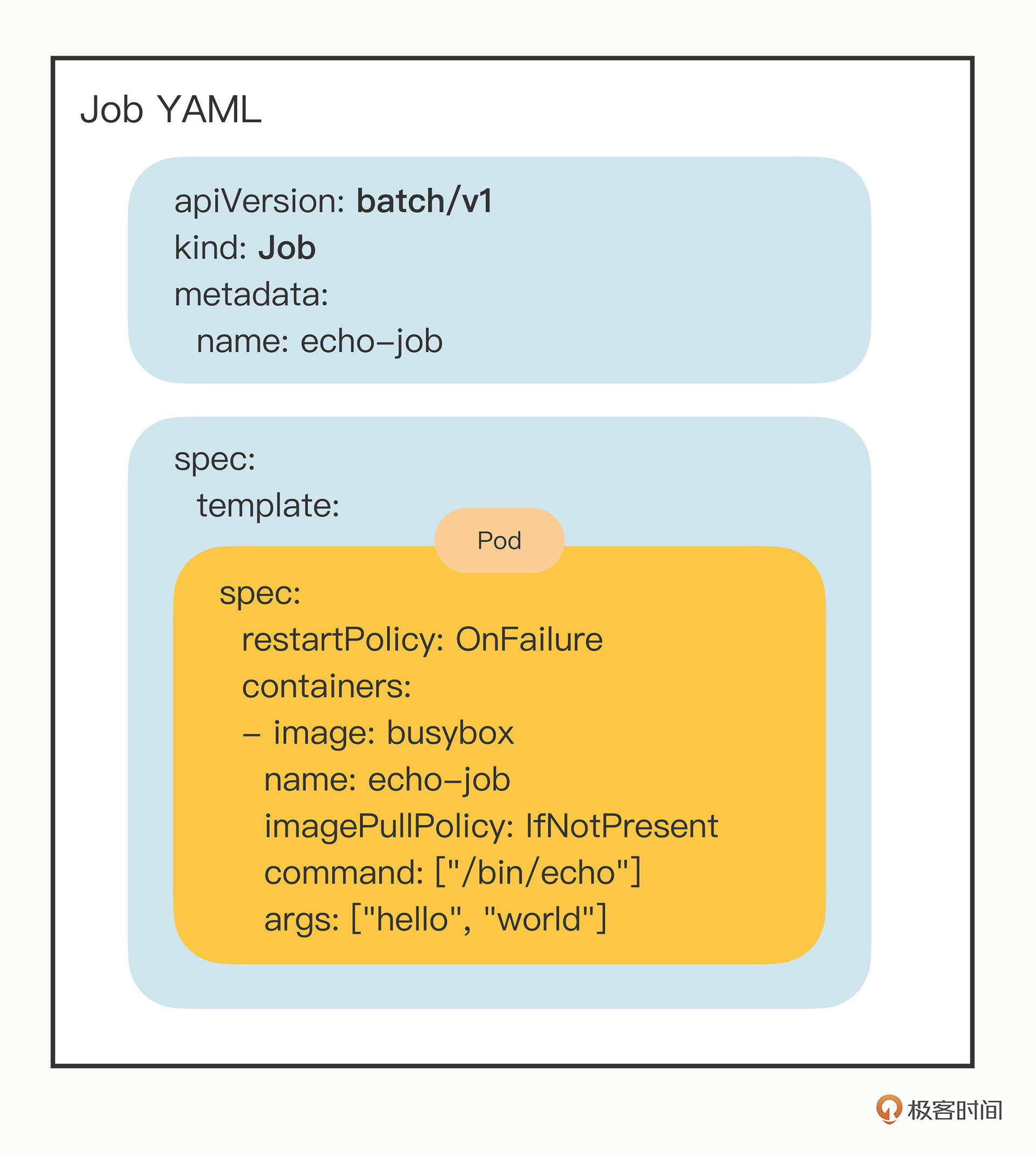 为了辅助你理解,我把Job对象重新组织了一下,用不同的颜色来区分字段,这样你就能够很容易看出来,其实这个“echo-job”里并没有太多额外的功能,只是把Pod做了个简单的包装:
