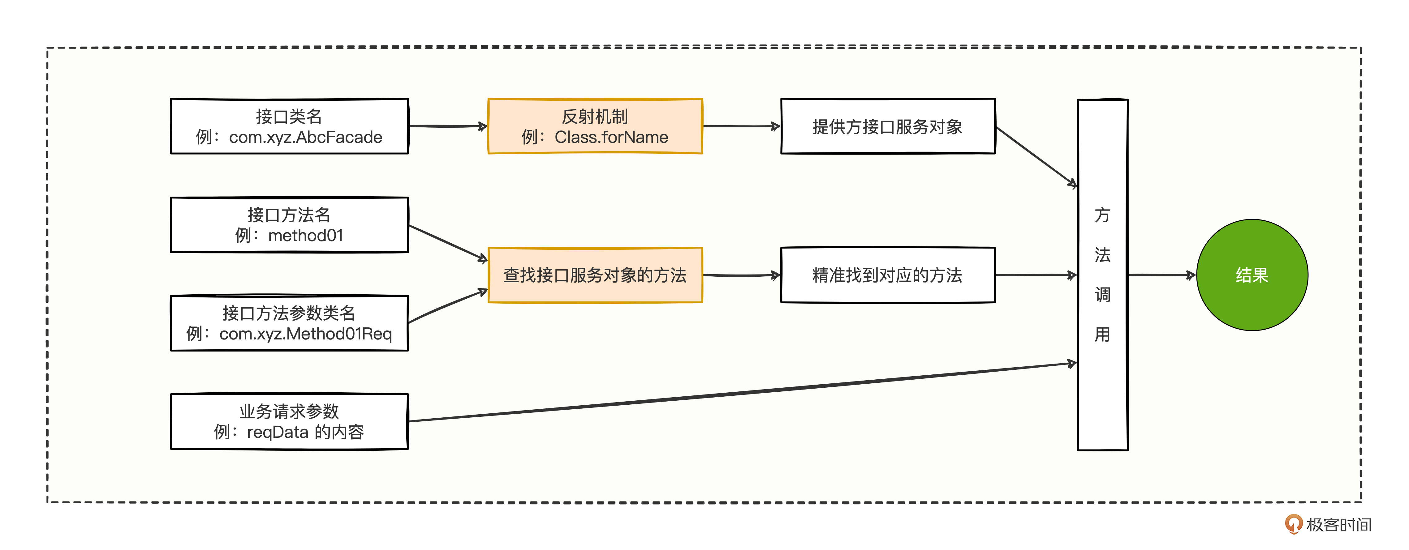 可以通过反射机制获取接口类名对应的类对象,通过类对象的简称获取到对应的接口服务,通过接口方法名和接口方法参数,来精准定位需要提供方接口服务中的哪个方法进行处理。