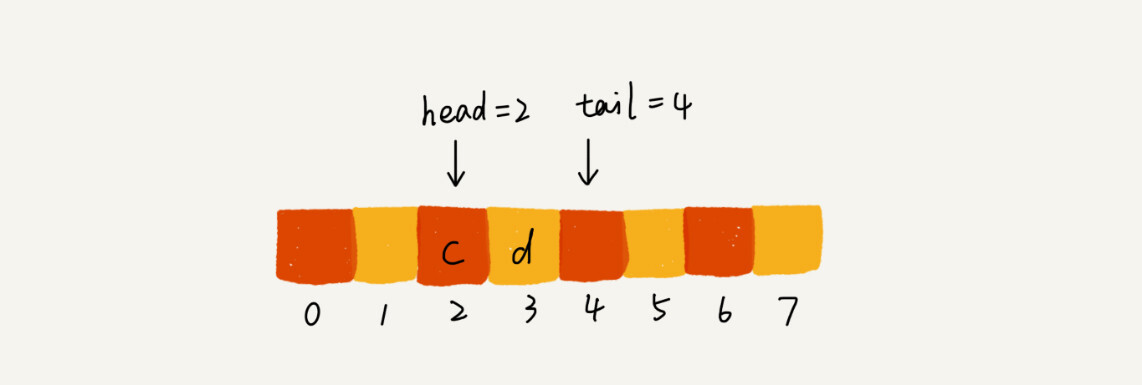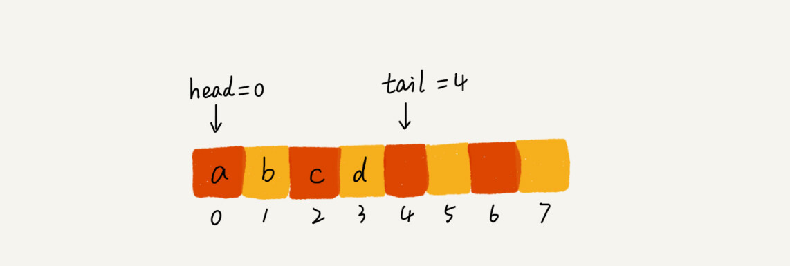 你可以结合下面这张图来理解。当a、b、c、d依次入队之后,队列中的head指针指向下标为0的位置,tail指针指向下标为4的位置。