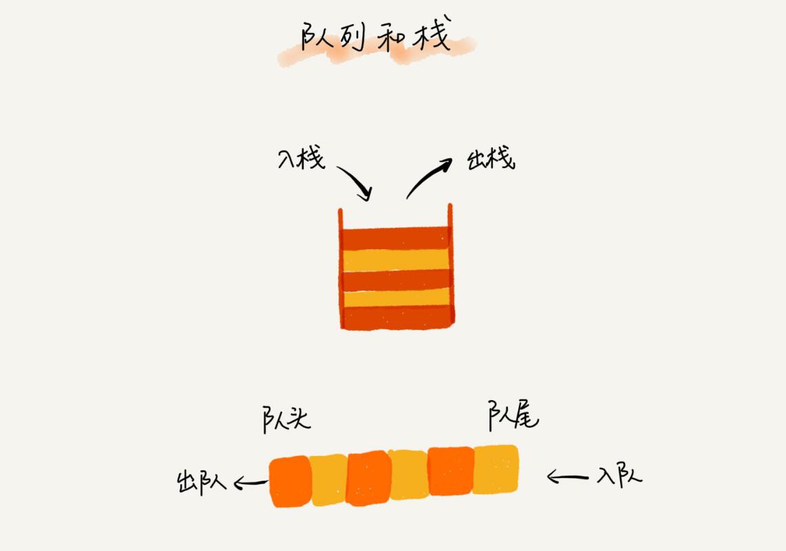 我们知道,栈只支持两个基本操作:入栈push()和出栈pop()。队列跟栈非常相似,支持的操作也很有限,最基本的操作也是两个:入队enqueue(),放一个数据到队列尾部;出队dequeue(),从队列头部取一个元素。