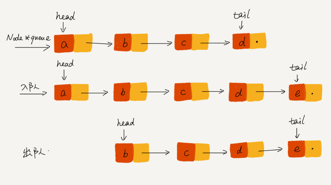 对于栈来说,我们只需要一个栈顶指针就可以了。但是队列需要两个指针:一个是head指针,指向队头;一个是tail指针,指向队尾。