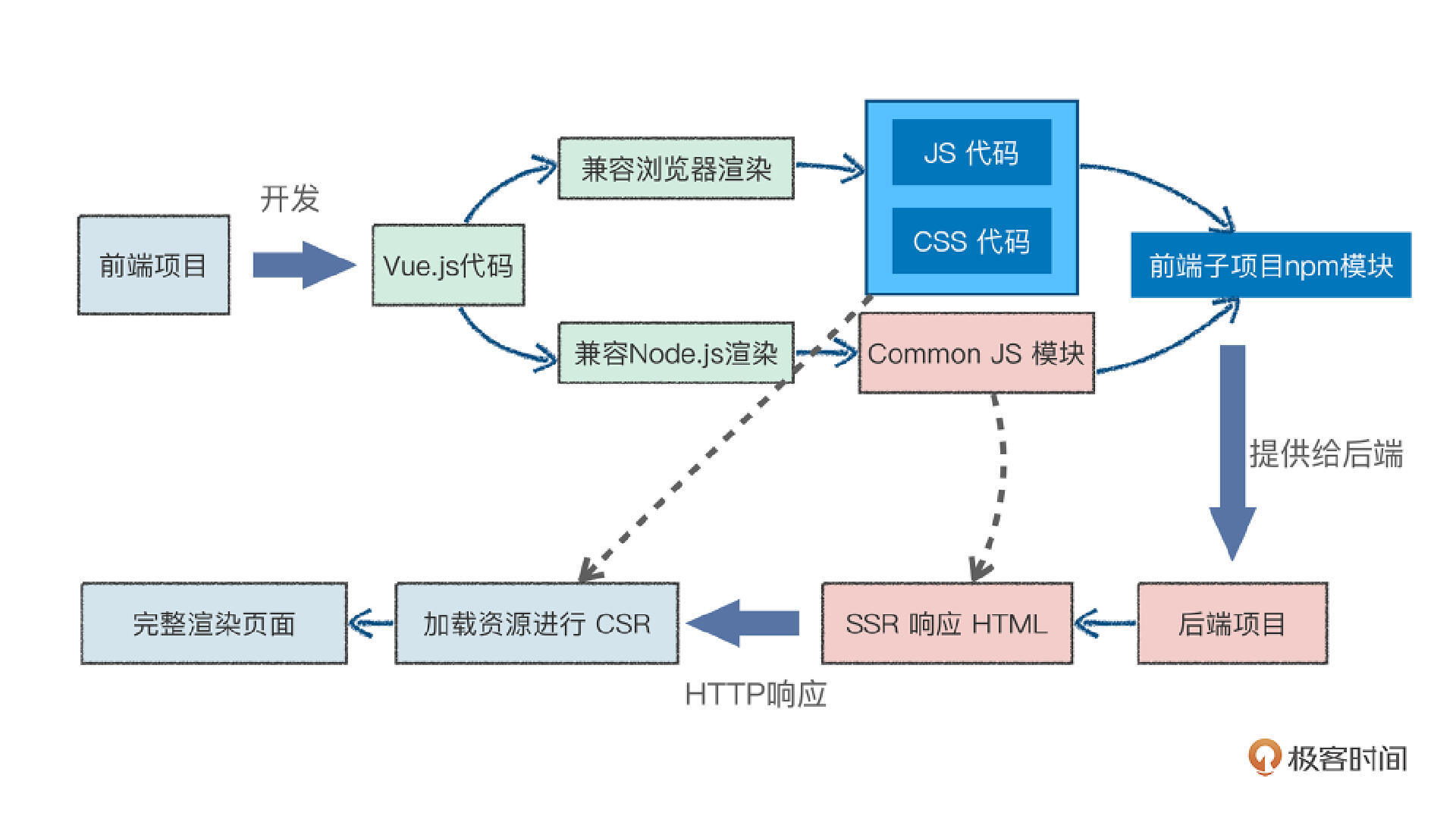 - 如果存在,就获取CommonJS模块和对应的CSS代码,通过Vue.js的SSR API进行转换成HTML,最后响应给浏览器,完成一个SSR流程和后续在浏览器里的CSR流程。