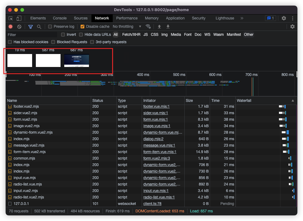 但在JavaScript代码还没通过<script>标签加载出来之前,整个页面一直是“白屏”,这个状态要等待JavaScript加载完,才能渲染出页面的功能视图。就像图中这样,浏览器控制台记录的白屏过程: