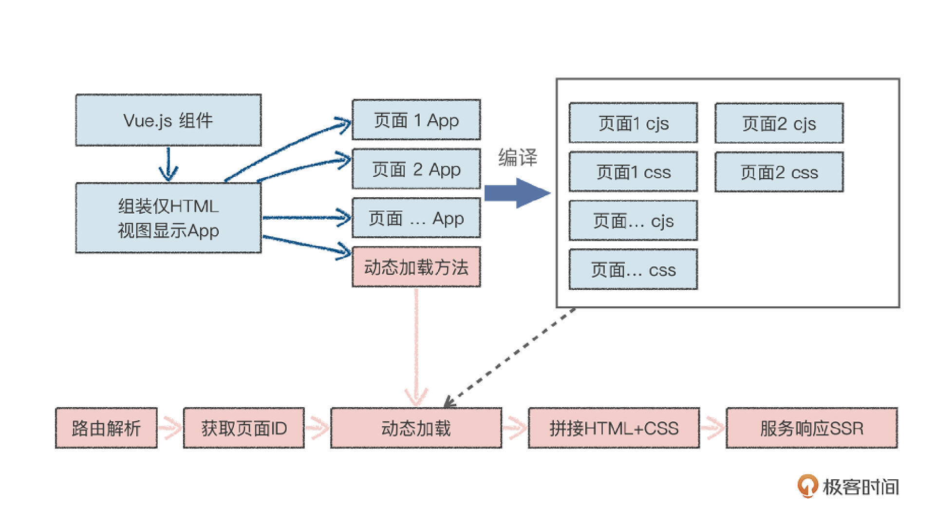 封装好需要SSR页面的Vue.js代码,就编译成CommonJS模块格式,虽然Node.js现在已经支持ES Module模块格式,但考虑兼容性问题,还是以CommonJS模块格式提供出来比较稳妥。与此同时,所有页面编译出的都是独立CommonJS文件和CSS文件。具体流程我用一张图来描述: