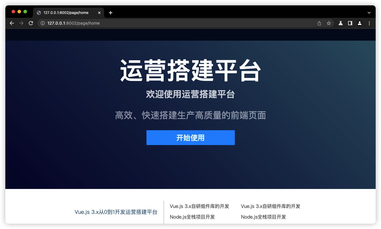 第四步,观察和等待浏览器的执行。我拿这节课的源码案例来演示一下最终效果,用SSR+CSR渲染了运营平台的首页: