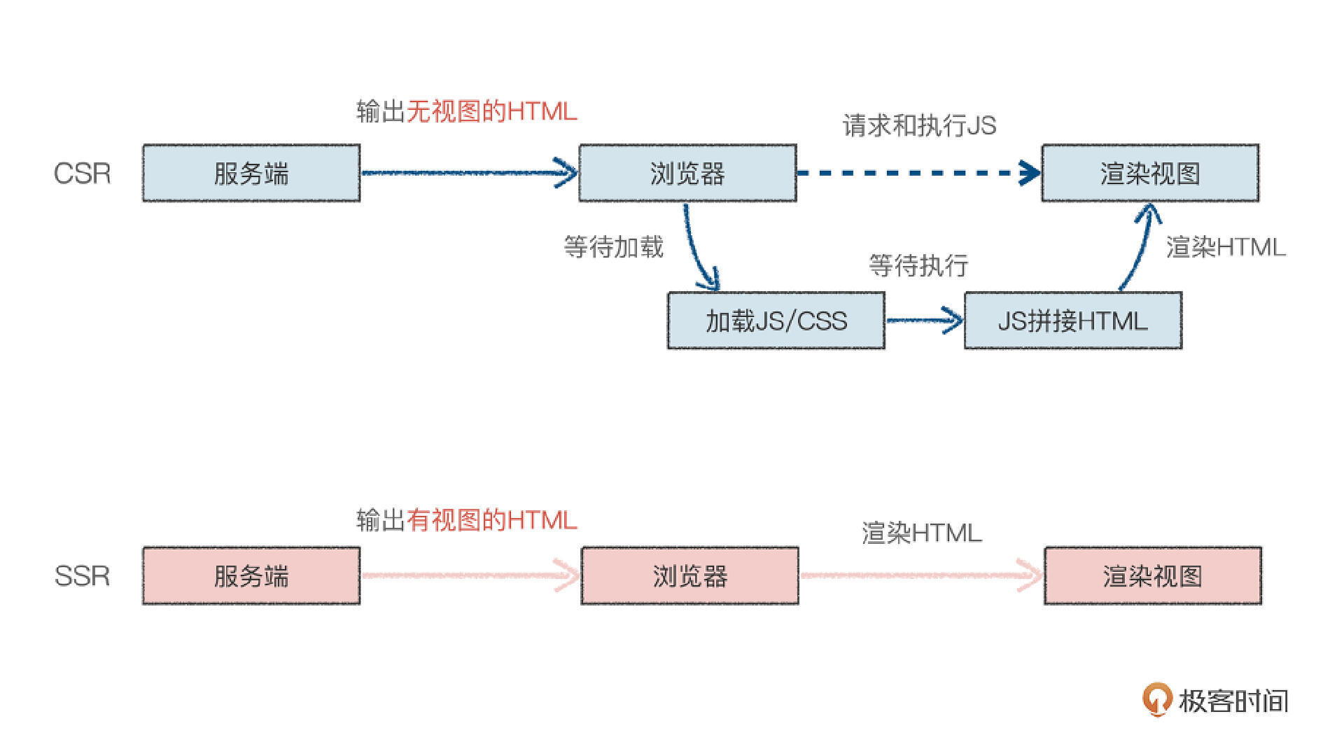 但是,“同构渲染”这个概念,定义众说纷纭,有开发者认为一套前端代码能支持SSR和CSR,那就是“同构渲染”,但又有开发者认为SSR和CSR结合是“异构渲染”等等,争议很多。为了减少歧义,在课程中我们就只称之为Vue.js的SSR和CSR。
