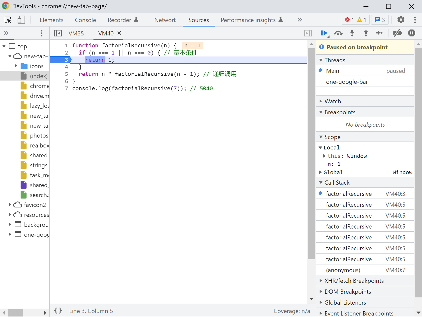 比如在前面乘阶的例子中,我们可以在调用栈(call stack)中看到函数每次被调用的过程。