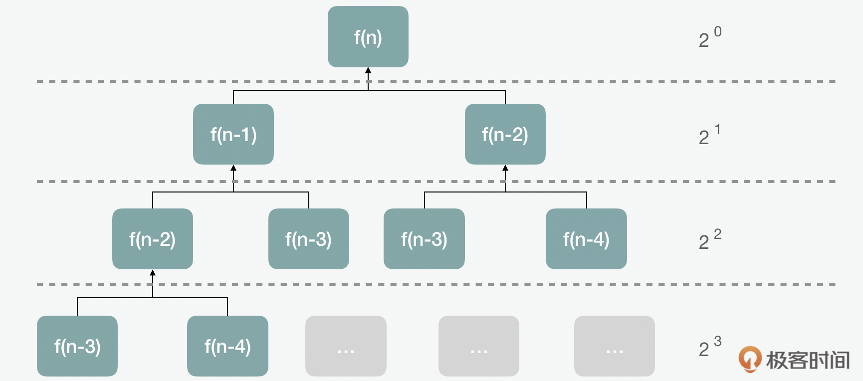 上面通过递推公式计算复杂度的方式还是很复杂的,那么还有没有更简单直观的计算方式呢?我们来看看递归树。递归树的方式,我们可以更直观地看出结果。这里当长路径为n的话,对应的耗时为$2^{n}-1$,所以最高的时间复杂就是$2^{n}$。