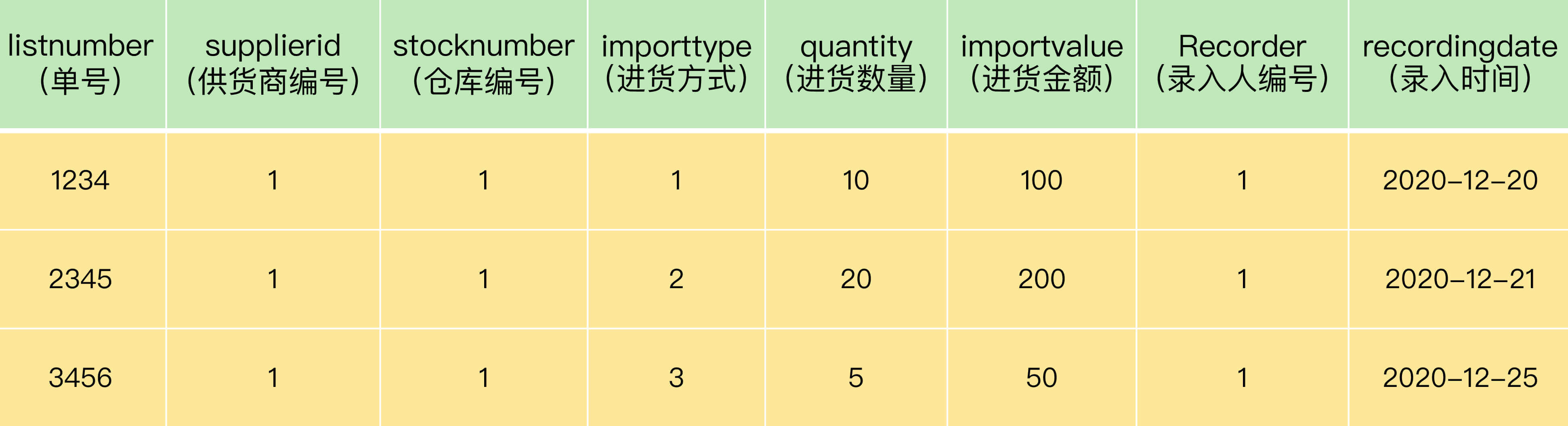 | mysql> select * from demo.importhead; +------------+------------+-------------+------------+----------+-------------+----------+---------------------+ | listnumber | supplierid | stocknumber | importtype | quantity | importvalue | recorder | recordingdate | +------------+------------+-------------+------------+----------+-------------+----------+---------------------+ | 1234 | 1 | 1 | 1 | 10.000 | 100.00 | 1 | 2020-12-10 00:00:00 | | 2345 | 1 | 1 | 2 | 20.000 | 2000.00 | 1 | 2020-12-10 00:00:00 | | 3456 | 1 | 1 | 1 | 20.000 | 2000.00 | 1 | 2020-12-10 00:00:00 | +------------+------------+-------------+------------+----------+-------------+----------+---------------------+ 3 rows in set (0.00 sec)
