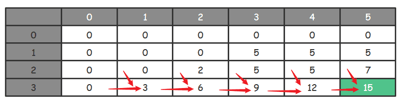 我在下面的表格中,用箭头画出了容量为 5 时的求解路径。你可以参照这个求解路径来加深对代码的理解。