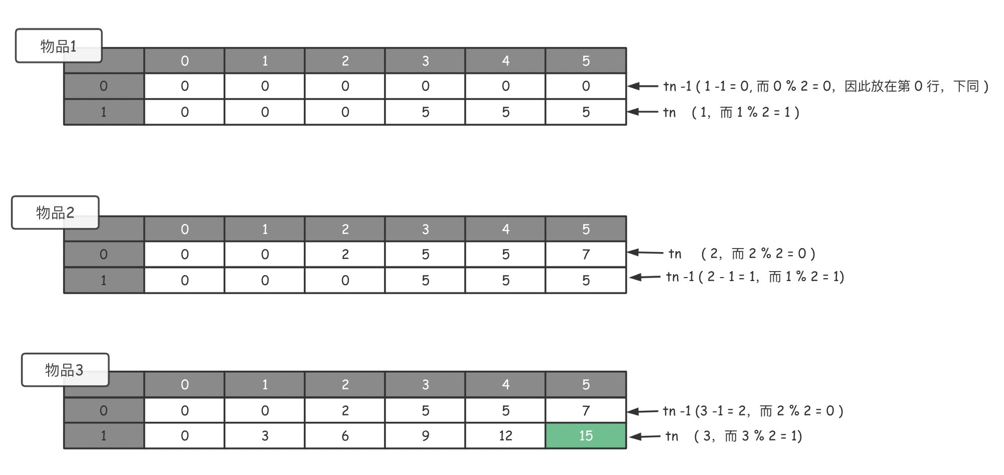 - 在计算第 2 个物品时,用第 1 行做 $tn - 1$ 的缓存,用第 0 行做 $tn$ 的缓存;