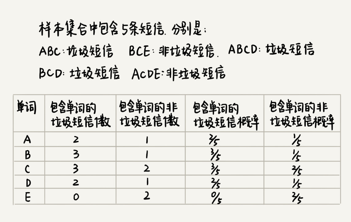 不过这种方法的前提是,我们有大量的样本数据,也就是说,要有大量的短信(比如1000万条短信),并且我们还要求,每条短信都做好了标记,它是垃圾短信还是非垃圾短信。