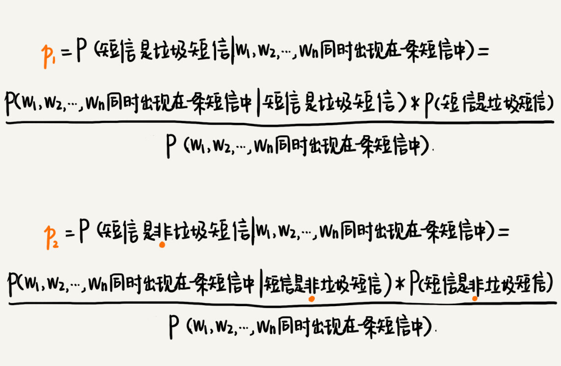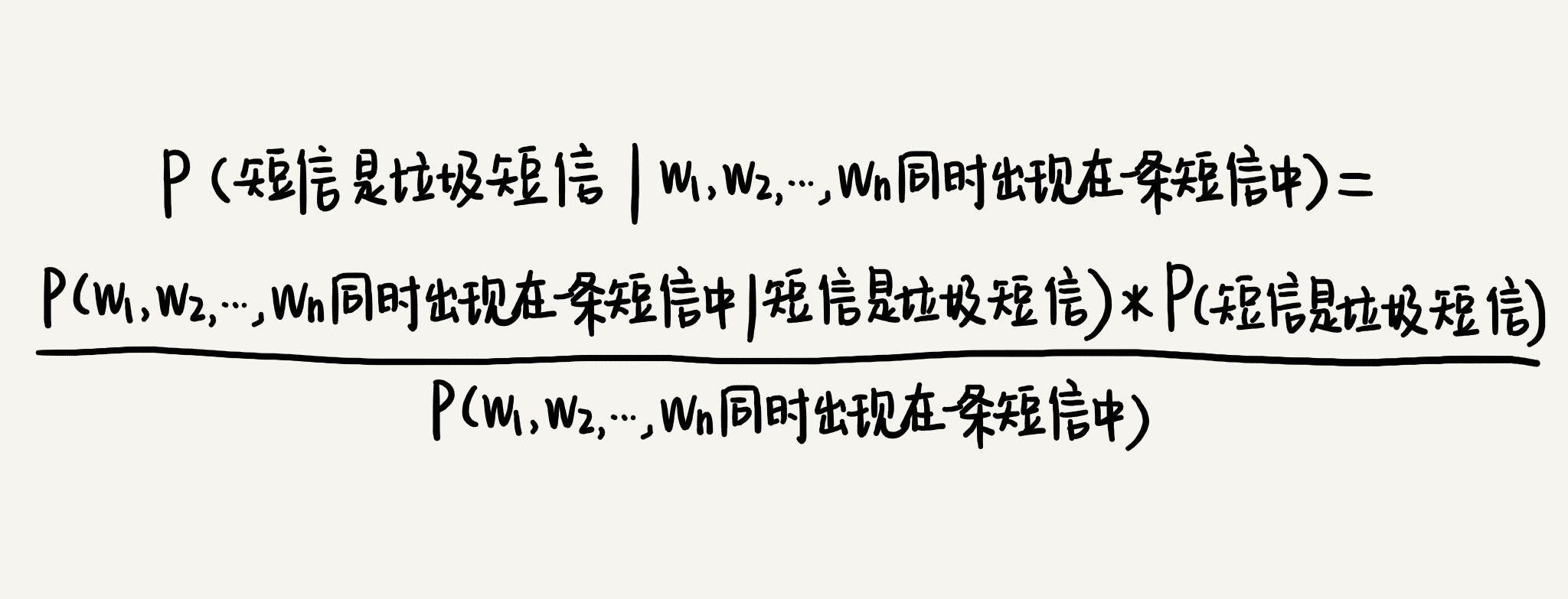 基于这条独立事件发生概率的计算公式,我们可以把P(W1,W2,W3,…,Wn同时出现在一条短信中 | 短信是垃圾短信)分解为下面这个公式: