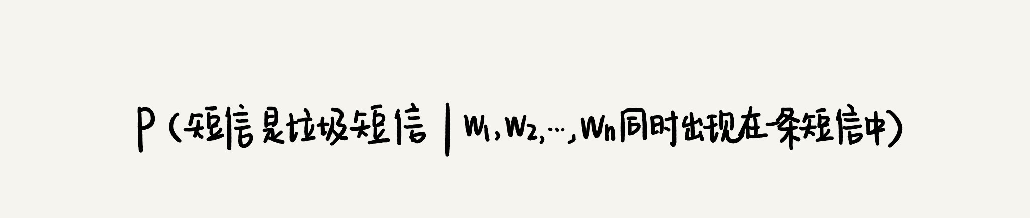 不过,P($W_{1}$,$W_{2}$,$W_{3}$,…,$W_{n}$同时出现在一条短信中)这个概率还是不好通过样本统计得到,原因我们前面说过了,样本空间有限。不过,我们没必要非得计算这一部分的概率值。为什么这么说呢?