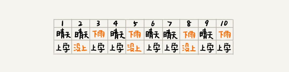 假设事件A是“小明不去上学”,事件B是“下雨了”。我们现在统计了一下过去10天的下雨情况和小明上学的情况,作为样本数据。