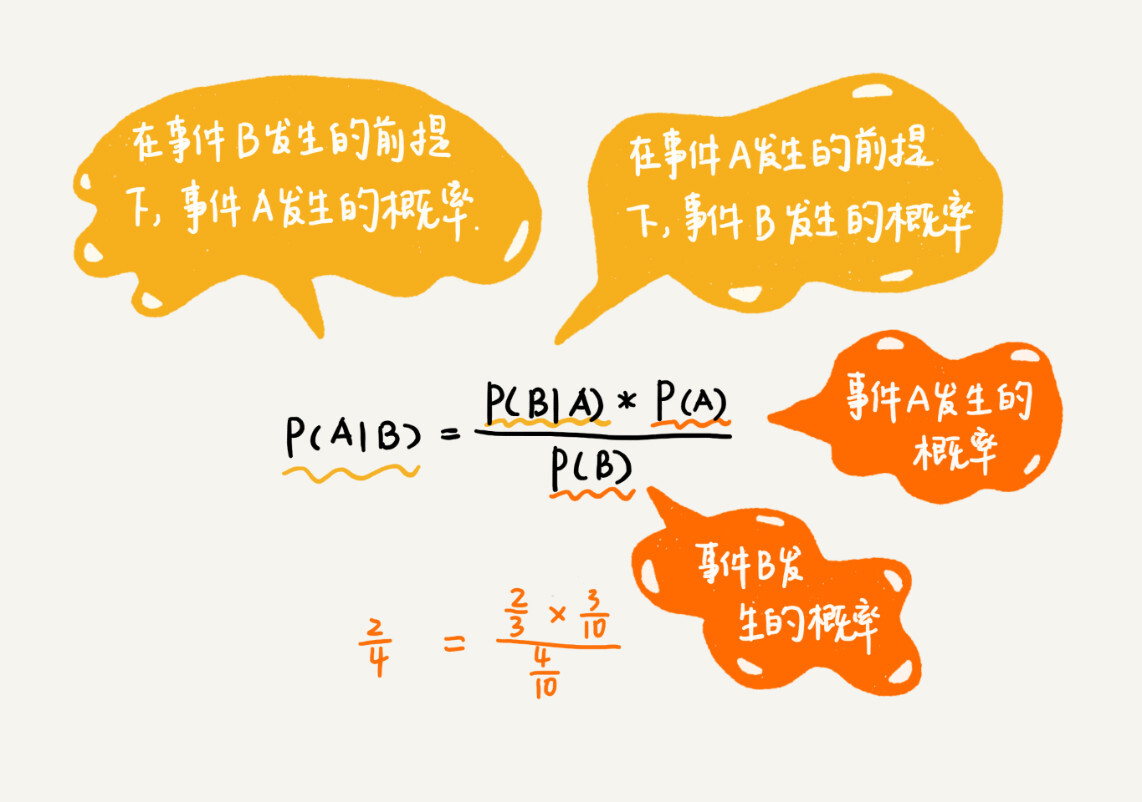 P($W_{1}$,$W_{2}$,$W_{3}$,…,$W_{n}$同时出现在一条短信中 | 短信是垃圾短信)这个概率照样无法通过样本来统计得到。但是我们可以基于下面这条著名的概率规则来计算。