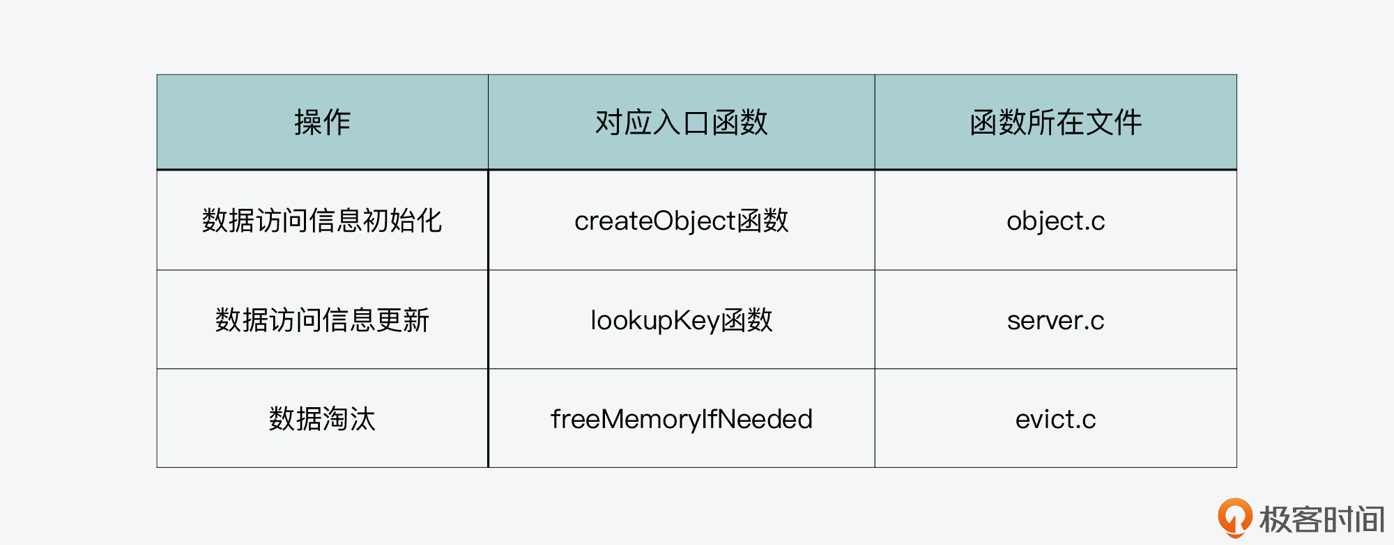 首先,我们要知道,LFU算法和LRU算法的基本步骤,实际上是在相同的入口函数中执行的。上节课围绕LRU算法的实现,我们已经了解到这些基本步骤包括数据访问信息的初始化、访问信息更新,以及实际淘汰数据。这些步骤对应的入口函数如下表所示,你也可以再去回顾下上节课的内容。