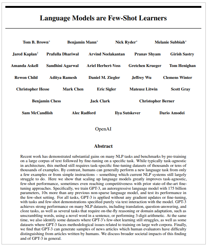 - 论文: Open AI的GPT-3模型:大模型是少样本学习者, Brown, T. B., Mann, B., Ryder, N., Subbiah, M., Kaplan, J., Dhariwal, P., … & Agarwal, S. (2020). Language models are few-shot learners. arXiv preprint arXiv:2005.14165.