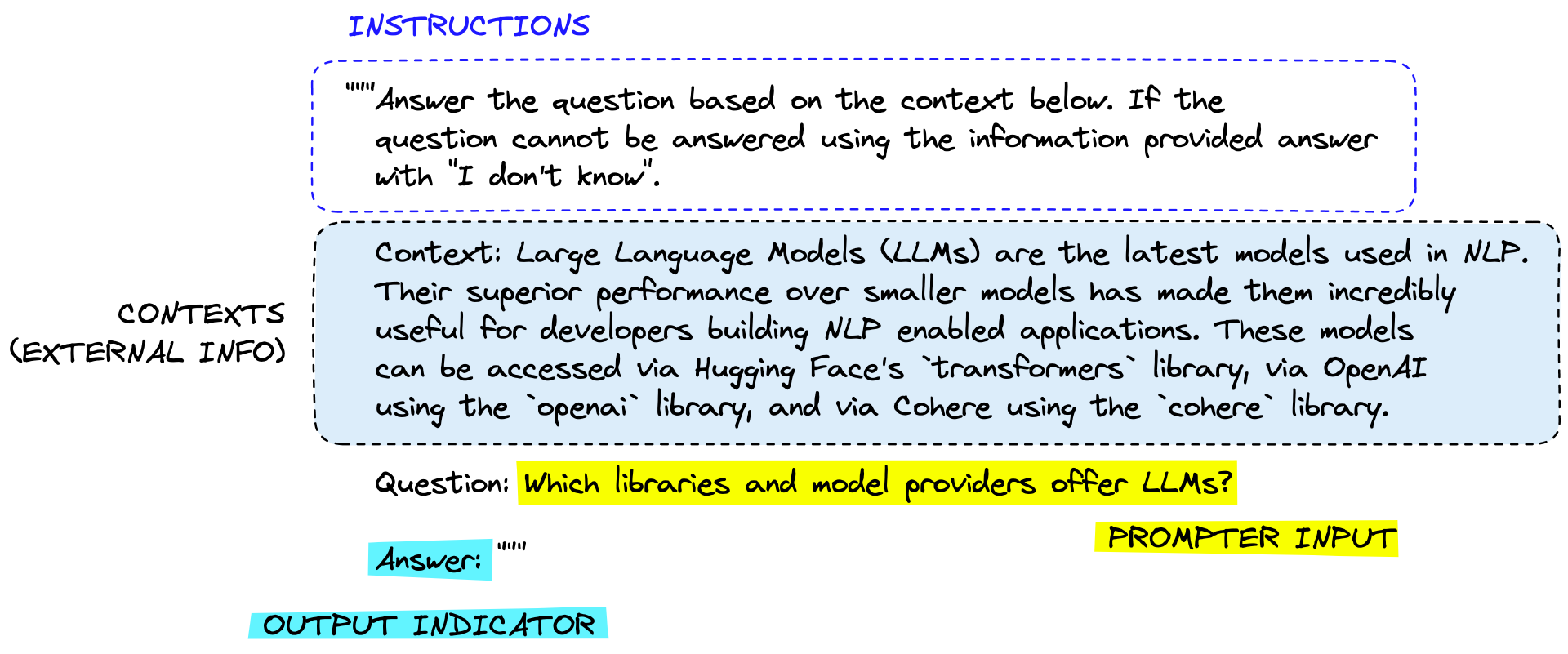 - 上下文(Context)则充当模型的额外知识来源。这些信息可以手动插入到提示中,通过矢量数据库检索得来,或通过其他方式(如调用API、计算器等工具)拉入。一个常见的用例时是把从向量数据库查询到的知识作为上下文传递给模型。