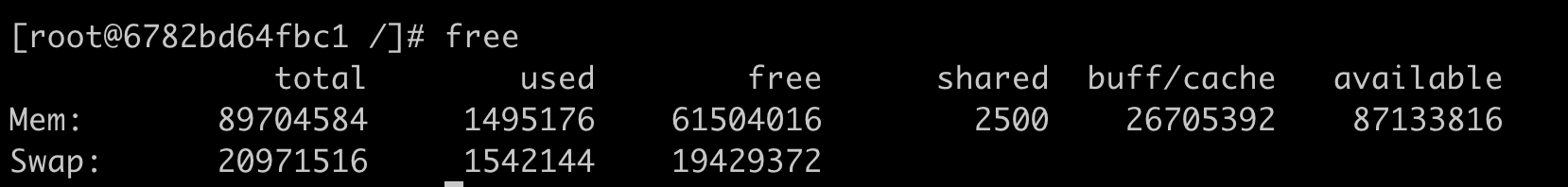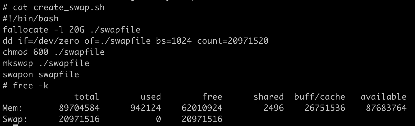 这个例子里,Swap空间的大小是20G,你可以根据自己磁盘空闲空间来决定这个Swap的大小。执行完这组命令之后,我们来运行free命令,就可以看到Swap空间有20G。