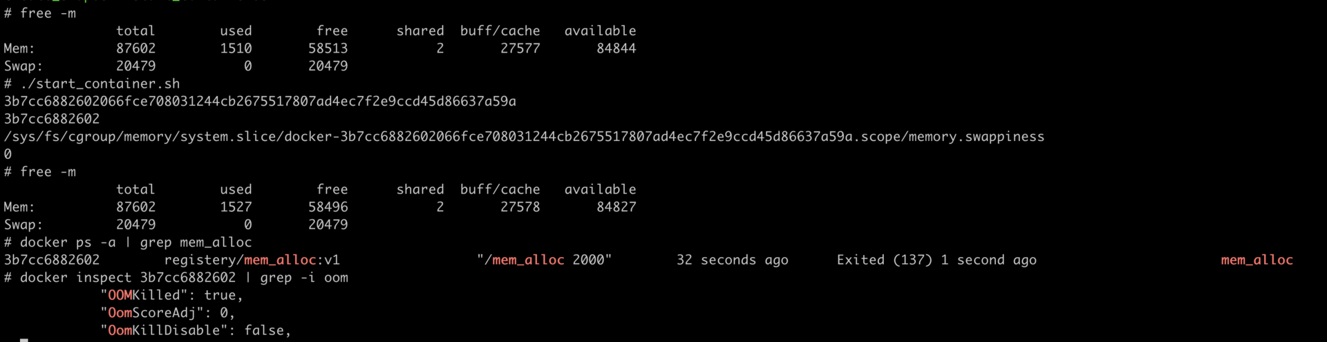 这次我们在容器中申请内存之后,Swap空间就没有被使用了,而当容器申请的内存超过memory.limit_in_bytes之后,就发生了OOM Kill。