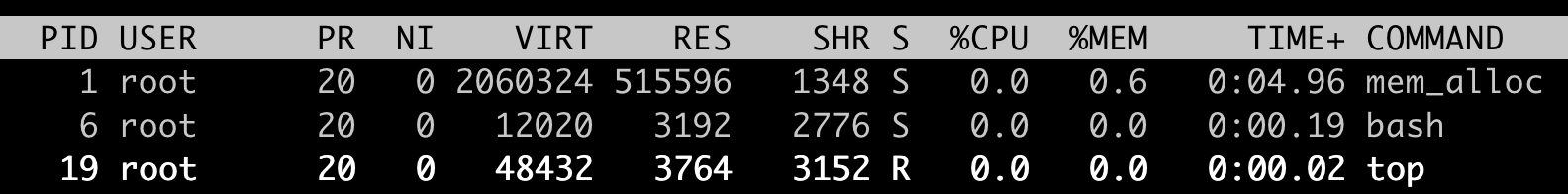 从下面的图中,我们可以看到,mem_alloc进程的RSS内存一直在512MB(RES: 515596)左右。