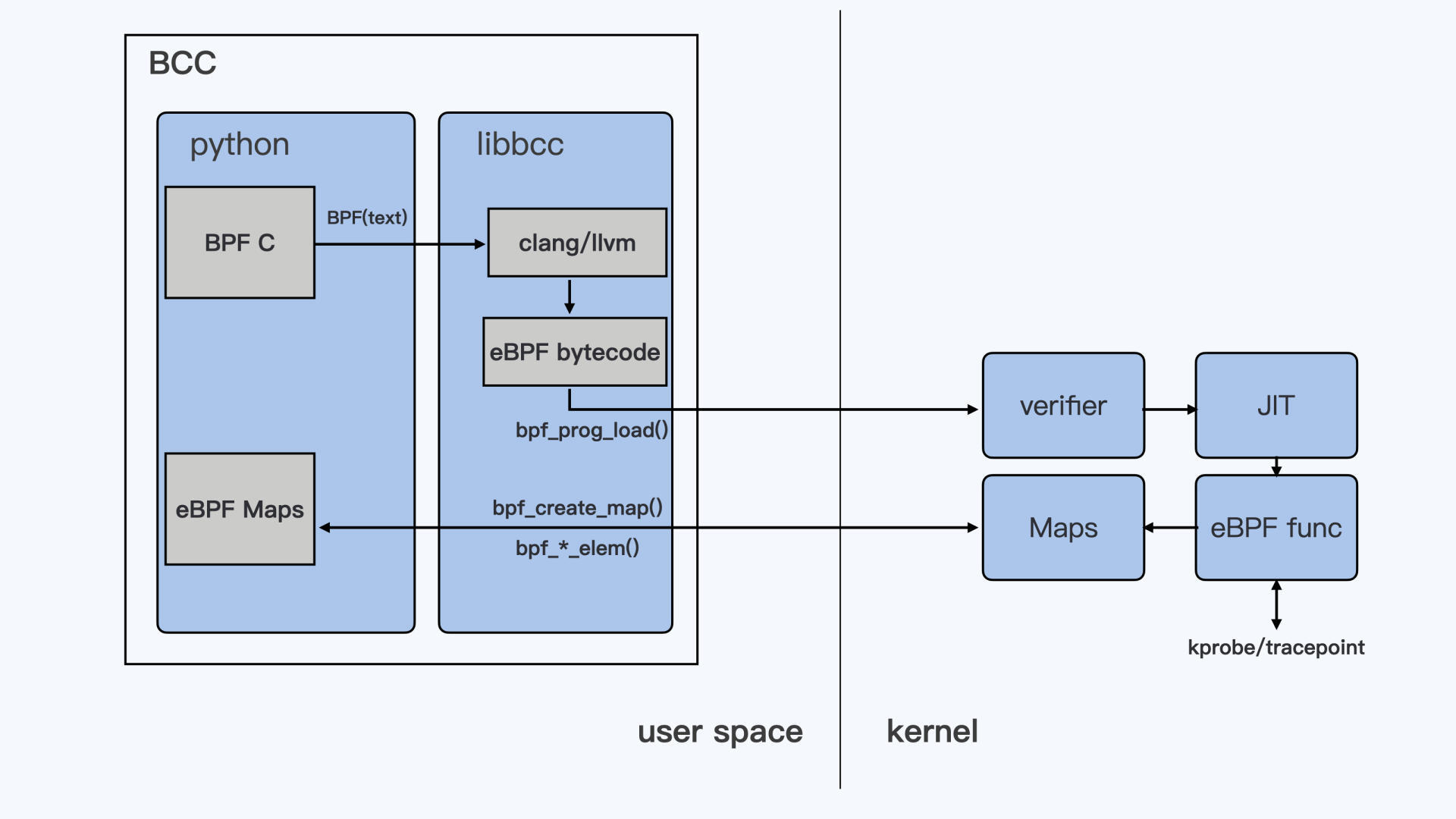 BCC的这种设计思想是为了方便eBPF程序的开发和使用,特别是eBPF内核态的代码对当前运行的内核版本是有依赖的,比如在4.15内核的节点上编译好的bytecode,放到5.4内核的节点上很有可能是运行不了的。