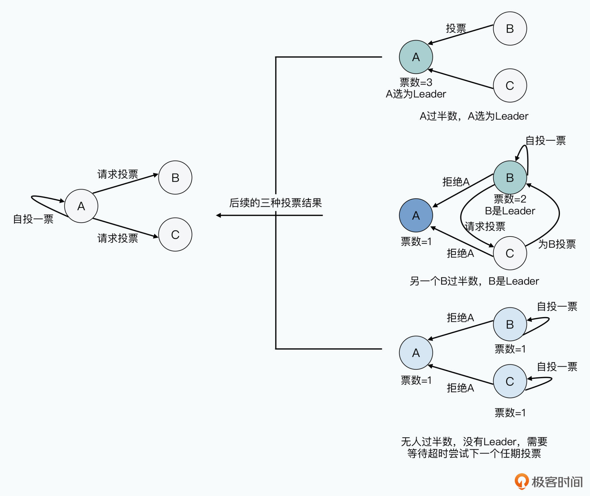 整个数据写入,就是一个前面我们说的两阶段提交的过程,只不过这个两阶段提交只需要“半数”通过,就可以发起第二阶段的提交操作,而不需要等待所有服务器都确认可以提交。当然,我们可能会遇到某些节点挂掉了,和两阶段提交里一样,我们要做的就是无限重试。