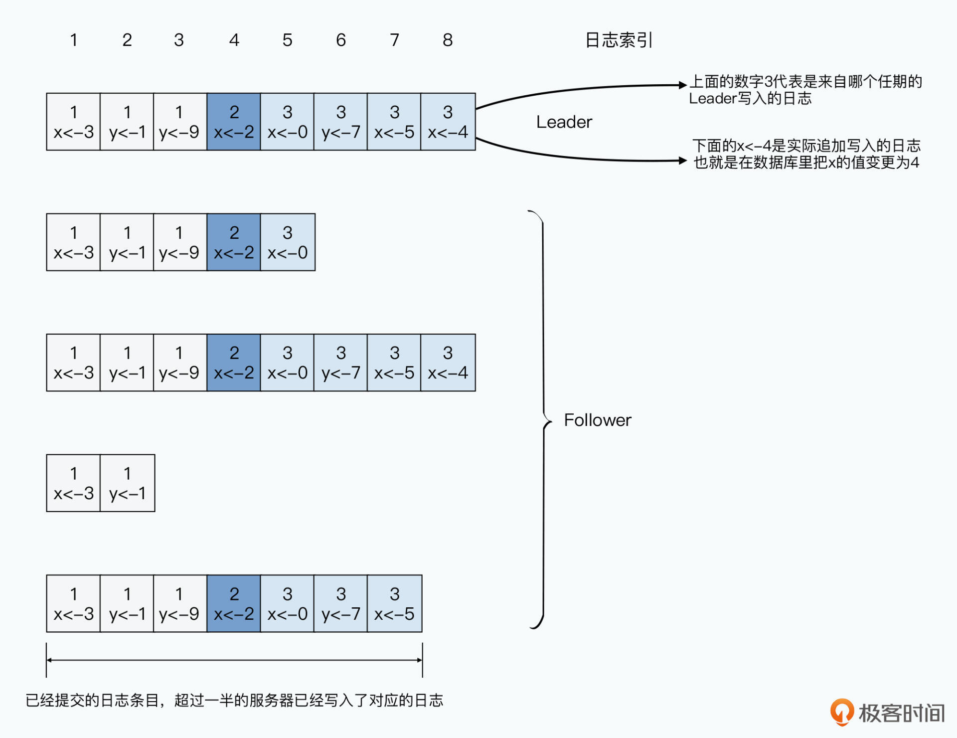 - 我们需要保障分布式共识,所以Leader需要把日志复制到其他节点上,并且确保所有节点的日志始终是一致的。这个,就带来了第二个问题,也就是日志复制问题。