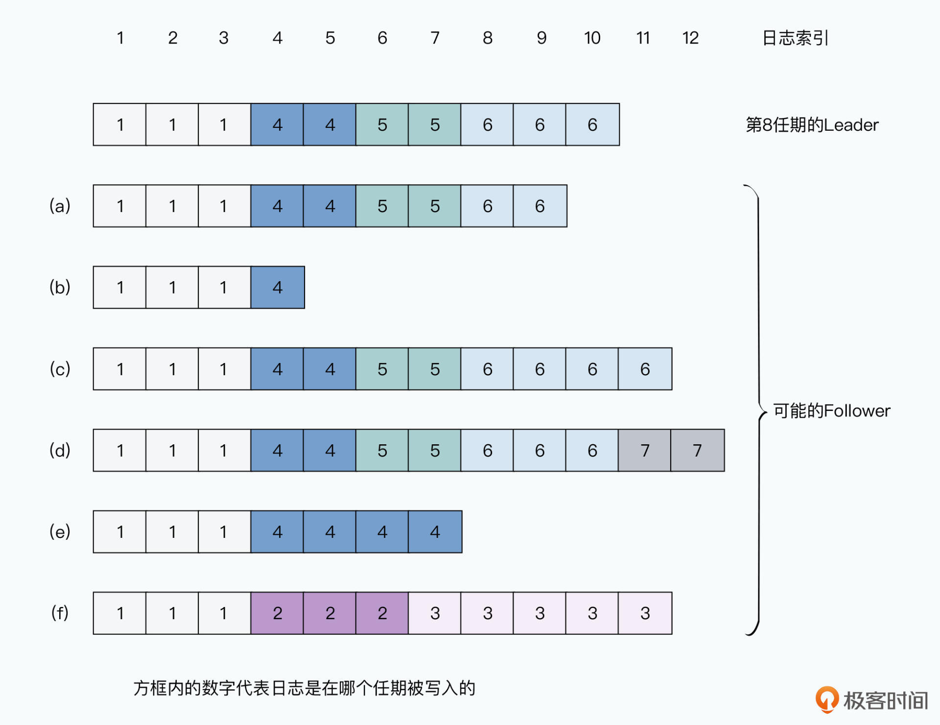 之所以需要这个过程,是因为我们不同服务器的日志,可能因为网络延时还没有同步,也可能因为硬件故障还包含未提交的日志。我在这里放上了论文里的图7,你可以看到: