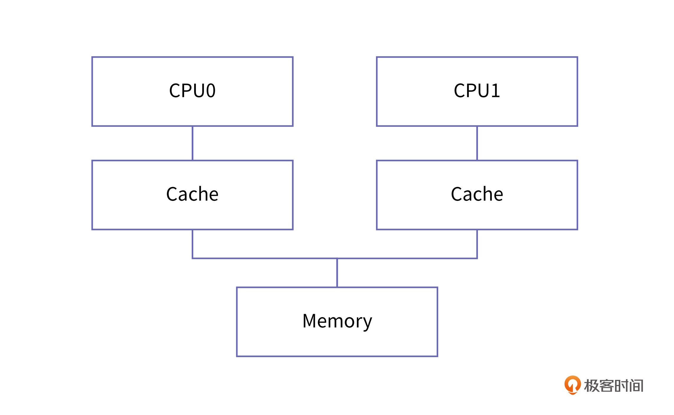为了让你更好理解核间同步的问题,我们现在来举个例子。我们使用两个CPU,分别叫做CPU0和CPU1,其中CPU0负责写数据,而CPU1负责读数据,我们看看在增加了store buffer这个结构以后,它们在进行核间同步时会遇到什么问题。