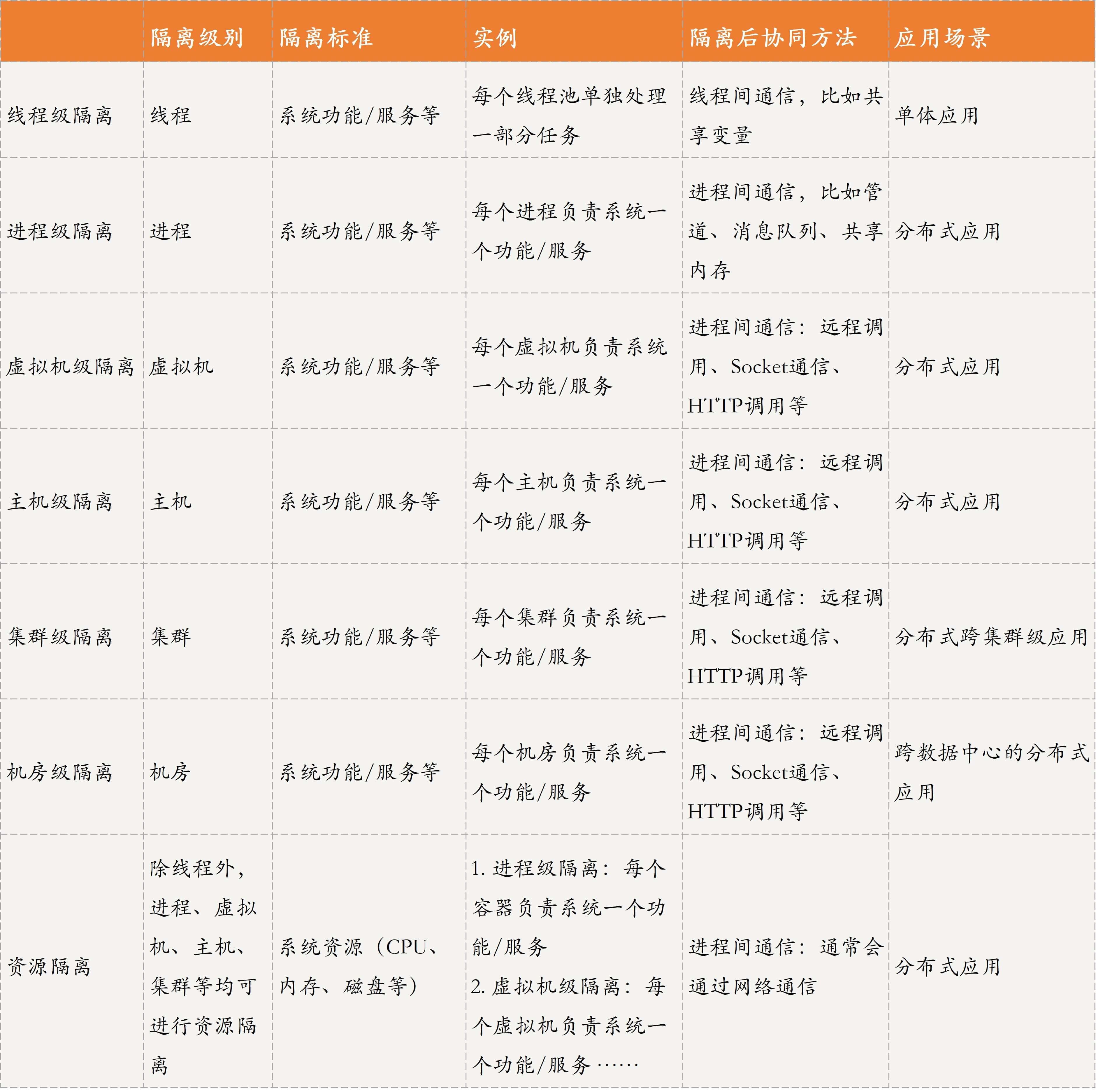 - 一类是以系统功能模块为粒度进行隔离。比如,通过系统功能/服务划分,将系统分为多个功能/服务模块,各个功能/服务模块之间实现松耦合,即一个功能/服务模块出现故障,不会影响其他功能/服务模块,根据功能模块或服务由线程执行还是进程执行,通常分为线程级隔离、进程级隔离。