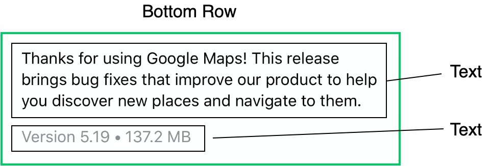 - 中间部分是两个文本在垂直方向上的组合,因此拆解为Column,Column内部则是两个Text。