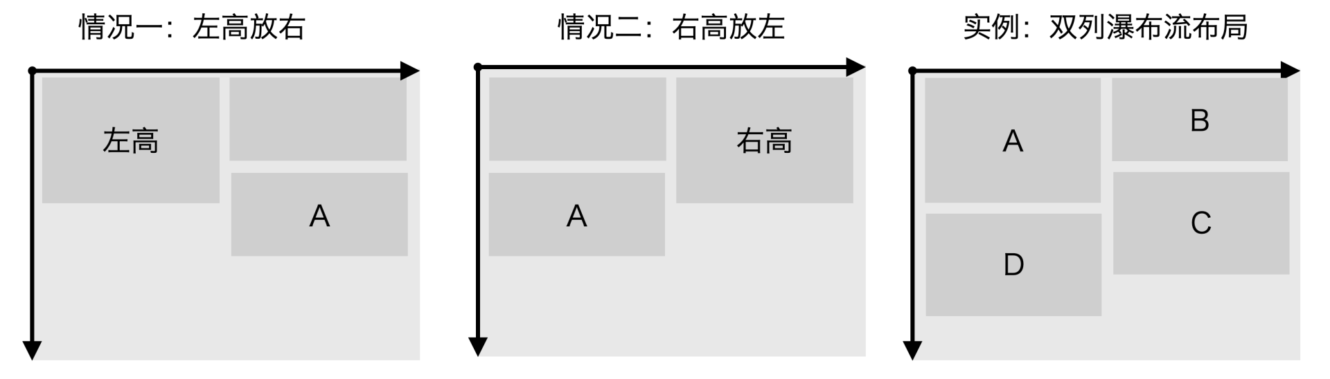 双列瀑布流布局只有两种情况,第一种情况是如果左边已有列表项的高度之和 startLeftY 大于右边已有列表项的高度之和 startRightY,那么下一个列表项就要放右边。第二种情况则刚好相反,我们需要把下一个列表项放在左边。简单来说就是,左高放右、右高放左。